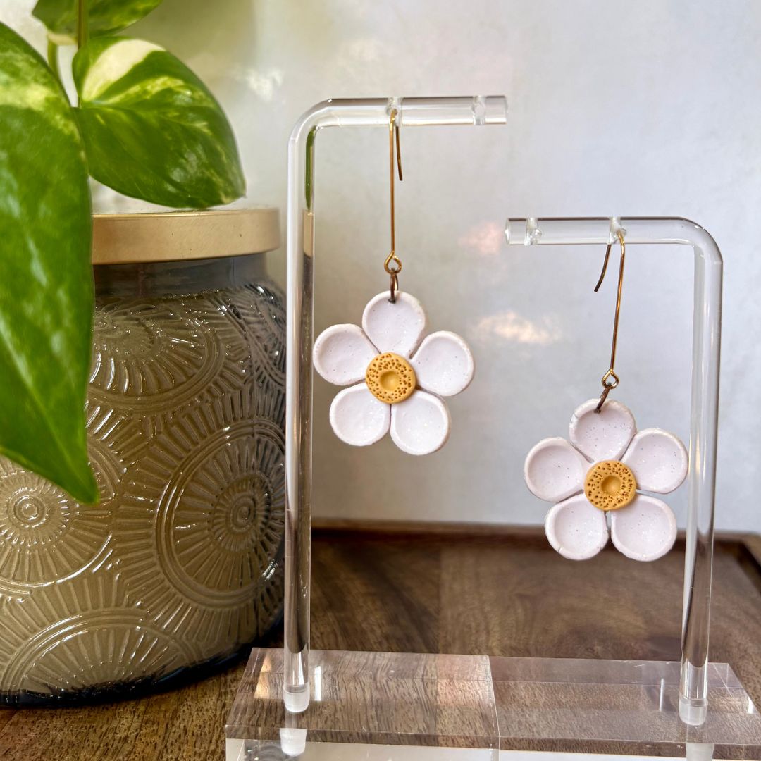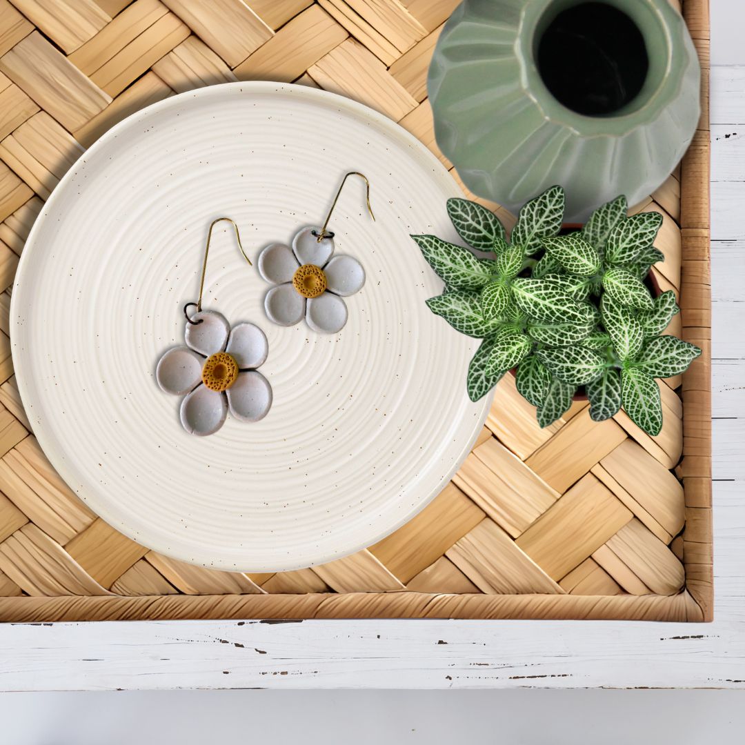 Cheerful daisy-shaped earrings handcrafted from polymer clay. Each pair features delicate petals in soft, cheerful tones with a charming, botanical design. Lightweight and comfortable for everyday wear. Perfect for adding a touch of nature-inspired style to any outfit.